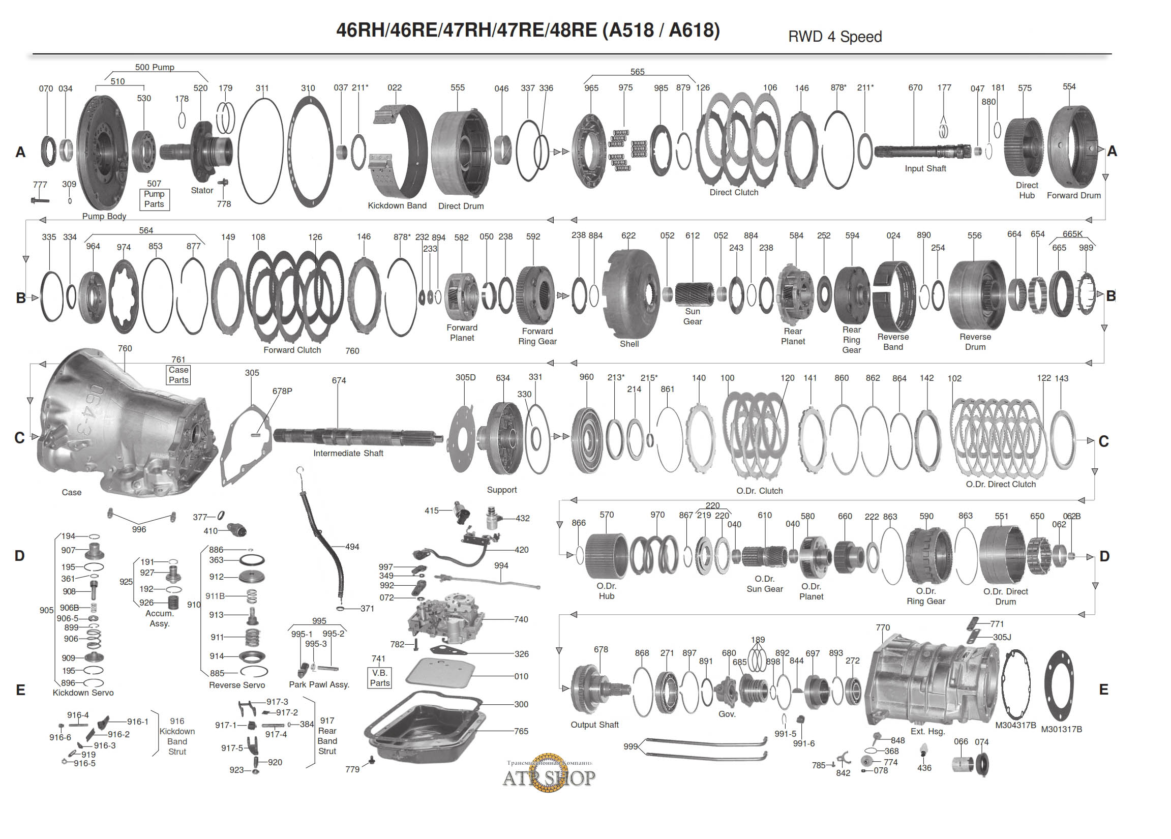 A518 была переименована в 46RH (retainer hydraulic) а позже получила букву Е 46RE (retainer electronic), а максимальная по моменту A618 в - 47RE и 48RE.